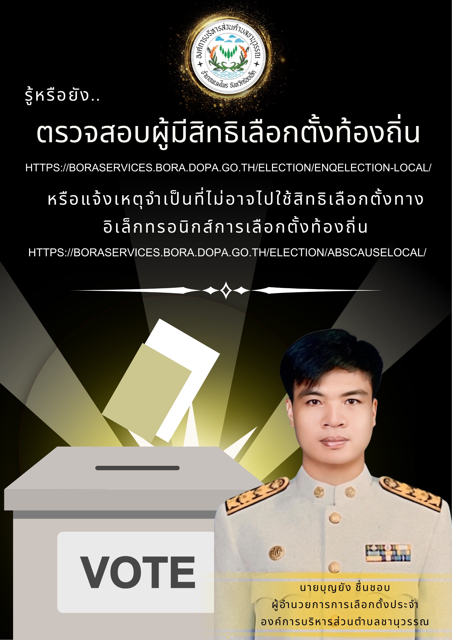 ✍️ รู้หรือยัง..!! เราสามารถตรวจสอบรายชื่อผู้มีสิทธิเลือกตั้งท้องถิ่นได้แล้ว โดยกดลิงค์ https://boraservices.bora.dopa.go.th/election/enqelection-local/ พร้อมกรอกรายละเอียดของเราและทำตามขั้นตอนได้เลย