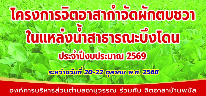 นำโดยนายพหลยุทธ บทมูล นายกองค์การบริหารส่วนตำบลชานุวรรณพร้อมด้วยคณะผู้บริหาร พนักงานส่วนตำบล ได้จัดทำโครงการจิตอาสากำจัดผักตบชวาในแหล่งน้ำสาธารณะบึงโดน ประจำปีงบประมาณ พ.ศ. 2569 ตั้งแต่วันที่ 20-22 ตุลาคม 2568 โดยมีจิตอาสาบ้านพนัส เข้าร่วมโครงการในครั้งนี้ด้วย