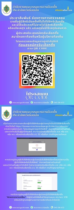 สามารถตรวจเช็คได้ที่ https://boraservices.bora.dopa.go.th/election/absvote/ หรือแสกนคิวอาร์โค้ดด้านล่างนี้ได้เลยค่ะ