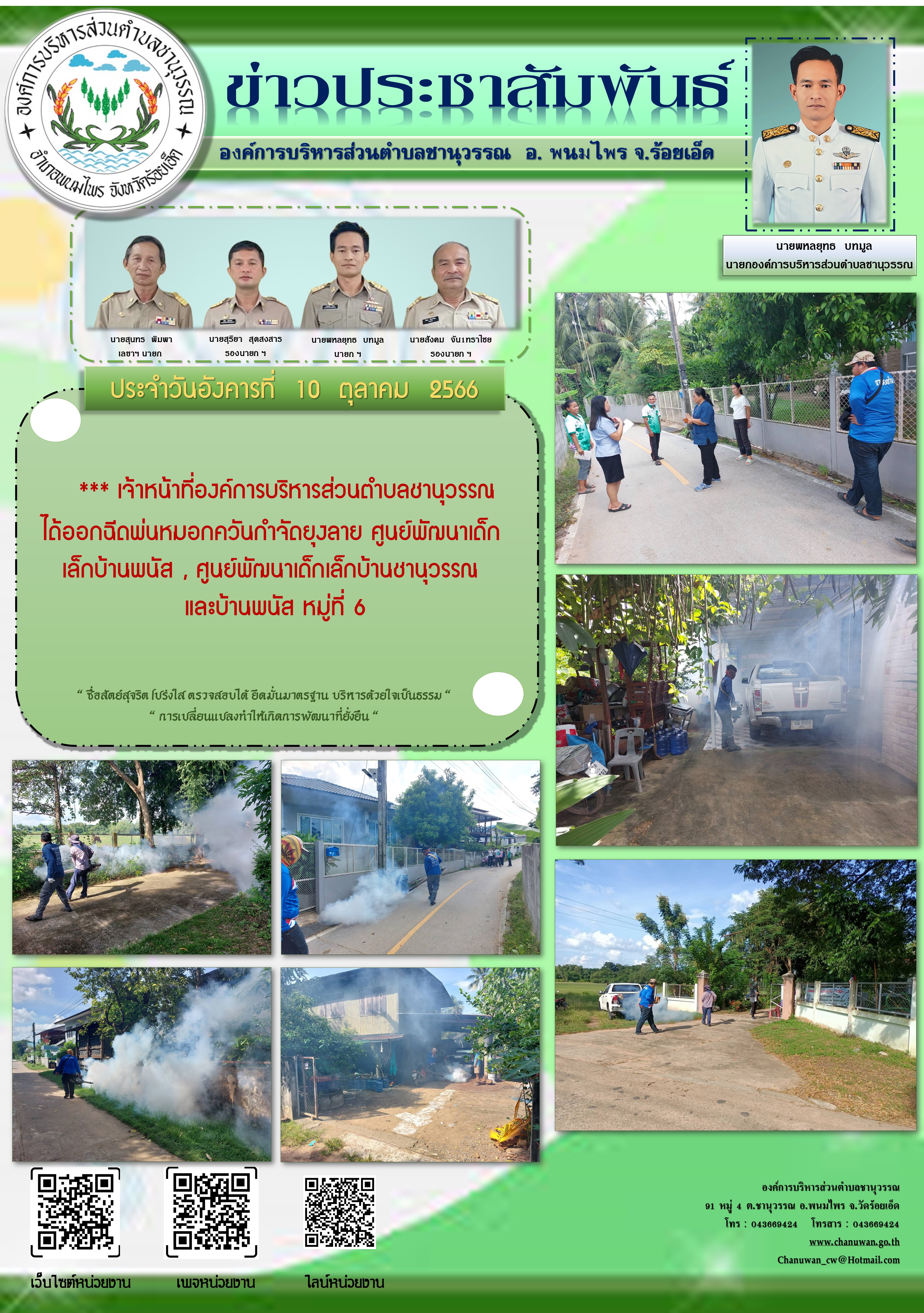 เจ้าหน้าที่องค์การบริหารส่วนตำบลชานุวรรณได้ออกฉีดพ่นหมอกควัน กำจัดยุงลายศูนย์พัฒนาเด็กเล็กบ้านพนัส และศูนย์พัฒนาเด็กเล็กบ้านชานุวรรณ